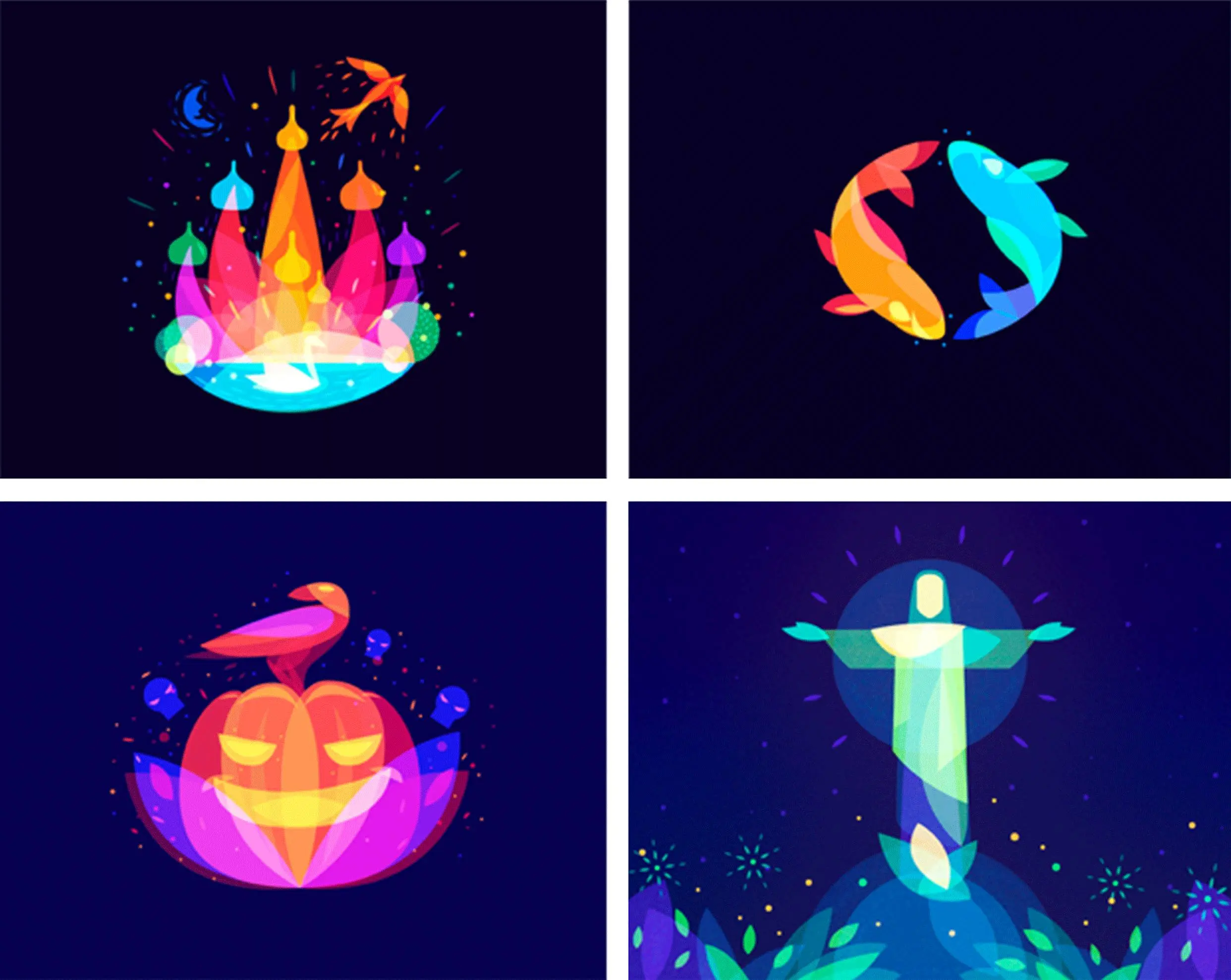 光,在视觉设计中显得越来越重要。光的运用能够使画面更加通透,彩色半透明元素的叠加使用,可以营造透光的彩色玻璃质感。在近期的视觉设计中,设计师们开始用这种方式对图形表现光感,体现图形关系的同时,又减少了厚重感,使画面更显明亮生动。