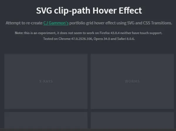 作者利用 SVG 路径剪裁属性与 CSS Transitions 重新制作了 CJ Gammon 网站中组合网格的悬停效果,一起来感受下。