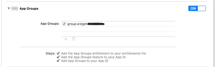 然后在containing App和widget两个target的Capabilities里,有个App Groups选项,打开这个选项,勾选上App Groups ID,要确保下面的三个小对勾都是正常的