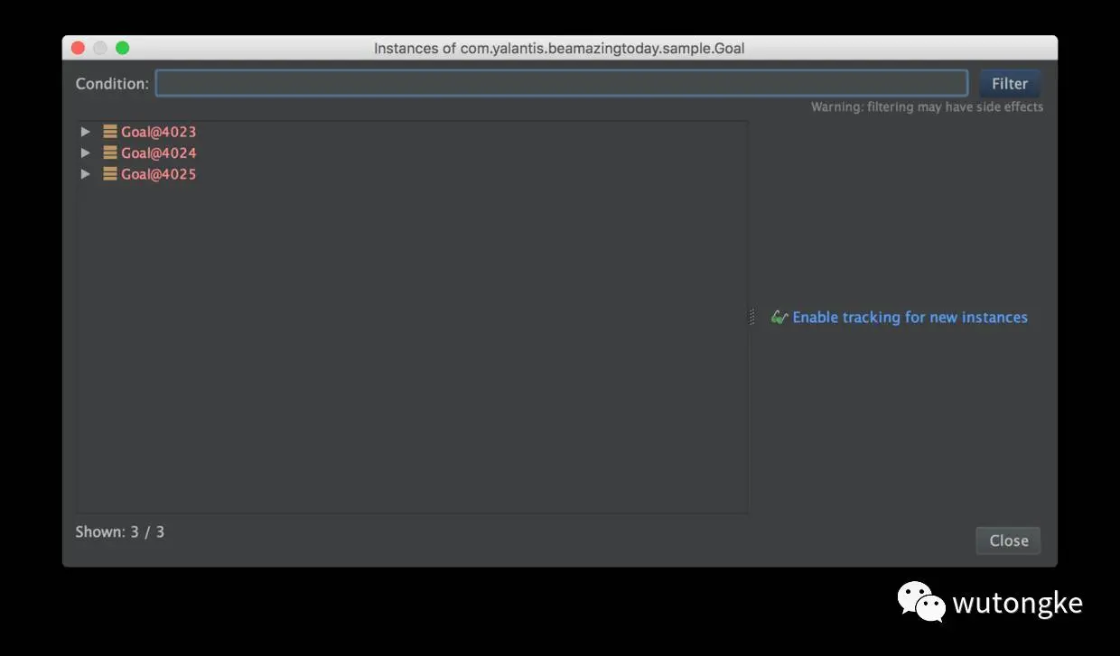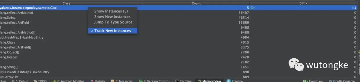 选择Track New Instances,然后在实例图右侧就可以看到实例生成栈: