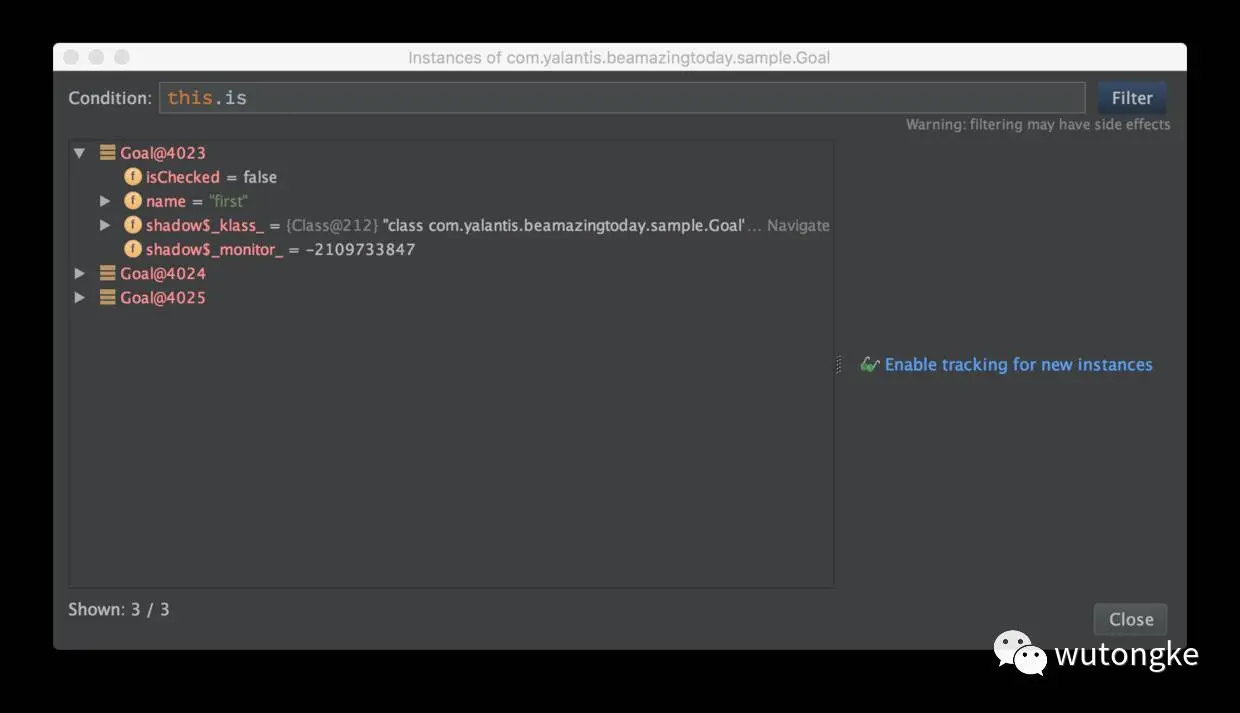 另外使用JVM Debugger Memory View还可以单独查看某个类生成的所有实例,并使用表达式条件过滤一些实例,同时debug时用到的inspect、Mark Object、Evaluate Expression、Add to Watches等操作都可以在JVM Debugger Memory View上进行,使用非常方便。