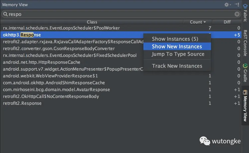 JVM Debugger Memory View根据名字可以知道是监测调试时内存使用情况的,其实它可以展示内存中各个类的实例数量,该数量是debug过程中两次运行暂停时新生成的实例数量。这样我们就可以知道代码执行时内存堆中发生什么。