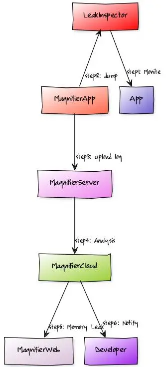 MagnifierApp在自动内存泄漏检测中是一个衔接检测组件(LeakInspector)和自动化云分析(MagnifierCloud)的中间性平台,它从LeakInspector的内存dump自动化上传MagnifierServer;