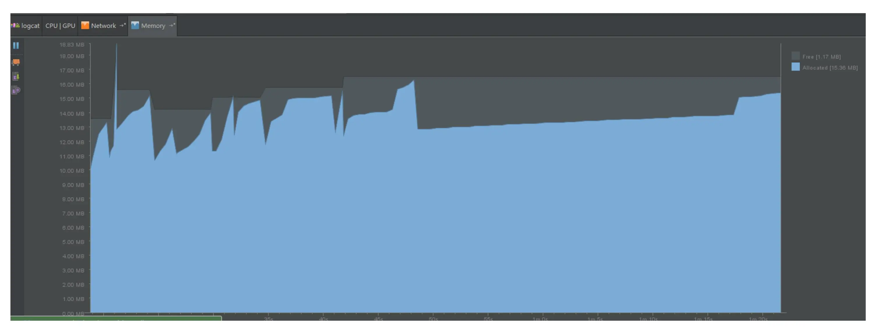 内存泄漏发生时的主要表现为内存抖动,可用内存慢慢变少: