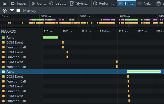 目前主流浏览器都在开发者工具中提供了监控页面重绘的功能。在 Blink/Webkit 内核的浏览器中,使用 Timeline 面板可以记录一个页面活动详情: