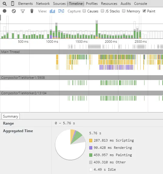 所有的浏览器都使用绿色来显示页面重绘和页面回流事件。上面的测试只是几个简单的示例,其中没有调用繁重的动画效果,所以布局渲染在总时间中占据了较大比重。减少页面回流和页面重绘,自然提高页面性能。