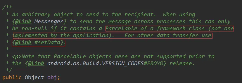 通过上面栗子可以看出,Messenger中进行数据传输必须将数据放入Message中,而Messenger和Message都实现了Parcelable接口,因此可以跨进程传输.简单来说Message中所支持的数据类型就是Messenger支持的数据类型,而Message中能作为载体传送数据的只有what,arg1,arg2,obj,replyTo,而obj在同一进程中是很实用的,但是进程间通讯的时候,在Android2.2以前obj不支持跨进程传递,2.2以后仅仅支持系统实现的Parcelable接口的对象才能通过它来传递,也就等于我们自定义的类即使实现了parcelable也无法通过obj传递,但是不要方,我们还有Bundle可以支持大量的数据传递.