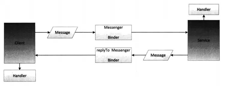 客户端进程中,首先需要绑定服务端service,绑定成功后用服务端返回的IBinder对象创建一个Messenger,通过这个Messenger向服务端发送消息,发送的消息类型为Message对象,如果需要服务端能够回应客户端,就必须和服务端一样,创建一个Handle并创建一个新的Messenger,并把这个Messenger对象通过Message的replyTo参数传递给服务端,服务端就可以通过replyTo参数回应客户端.