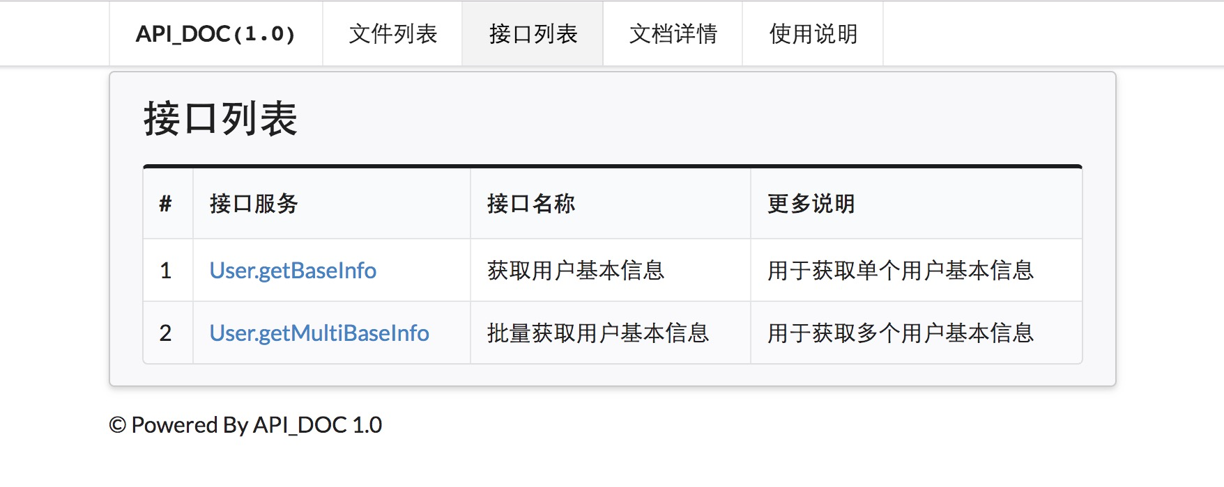(1) 列出所有的API文件。 (2) 点击文件名,可以查看里面的接口。 (3) 点击接口名称,可以查看接口的注释。