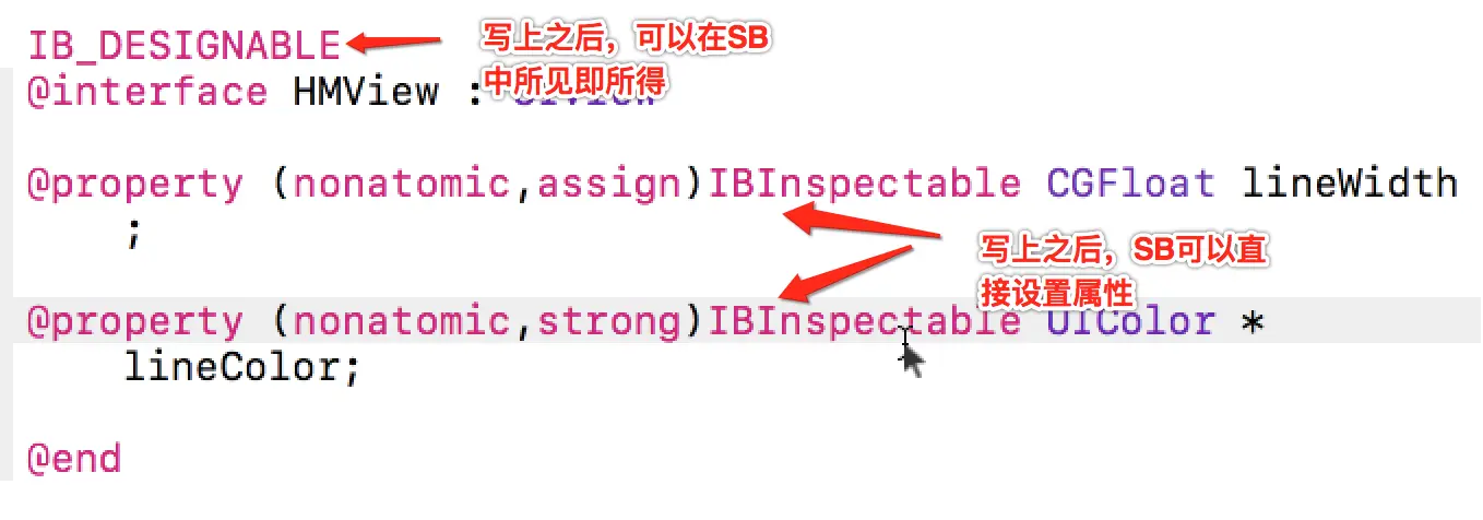 - IBInspectable 就是让SB上出现属性的修改框,可以在SB直接修改: