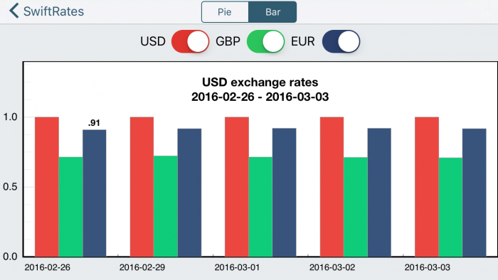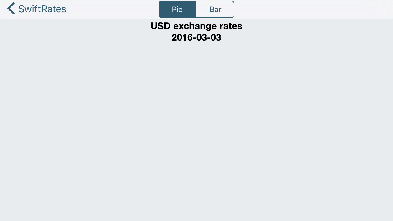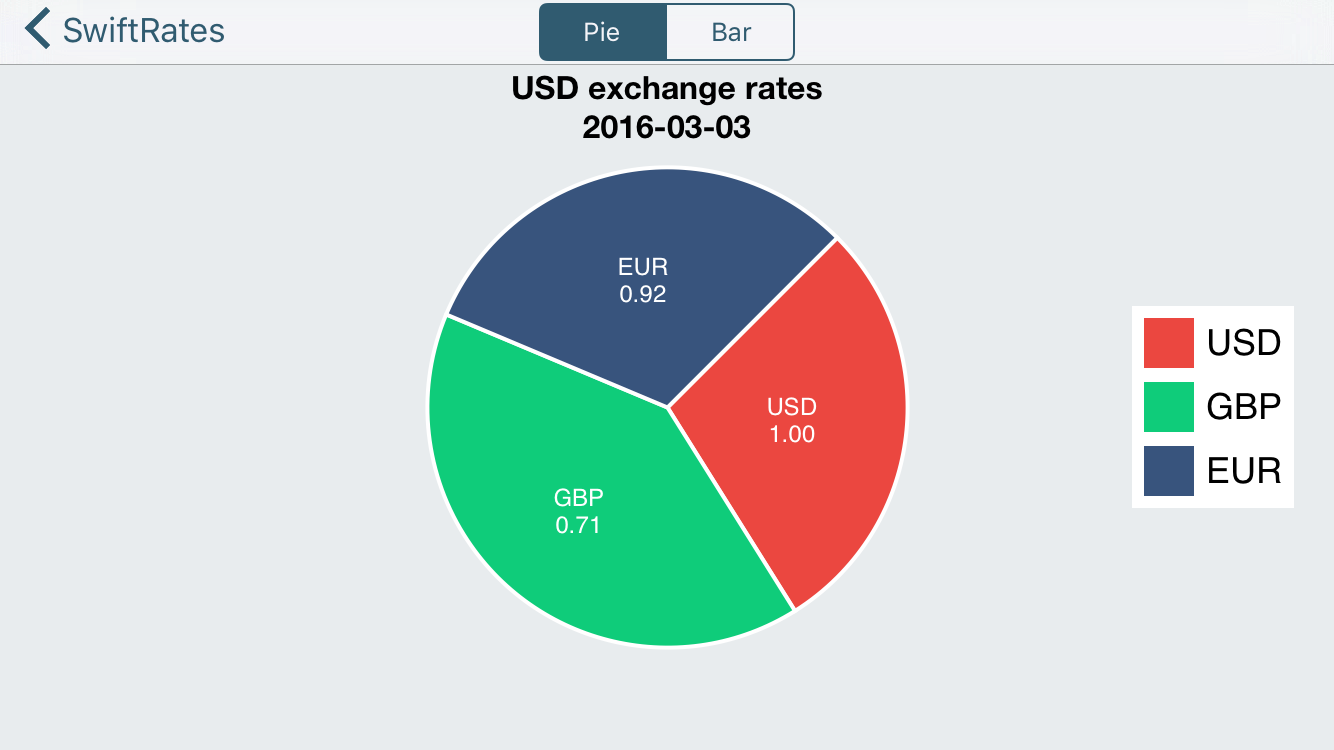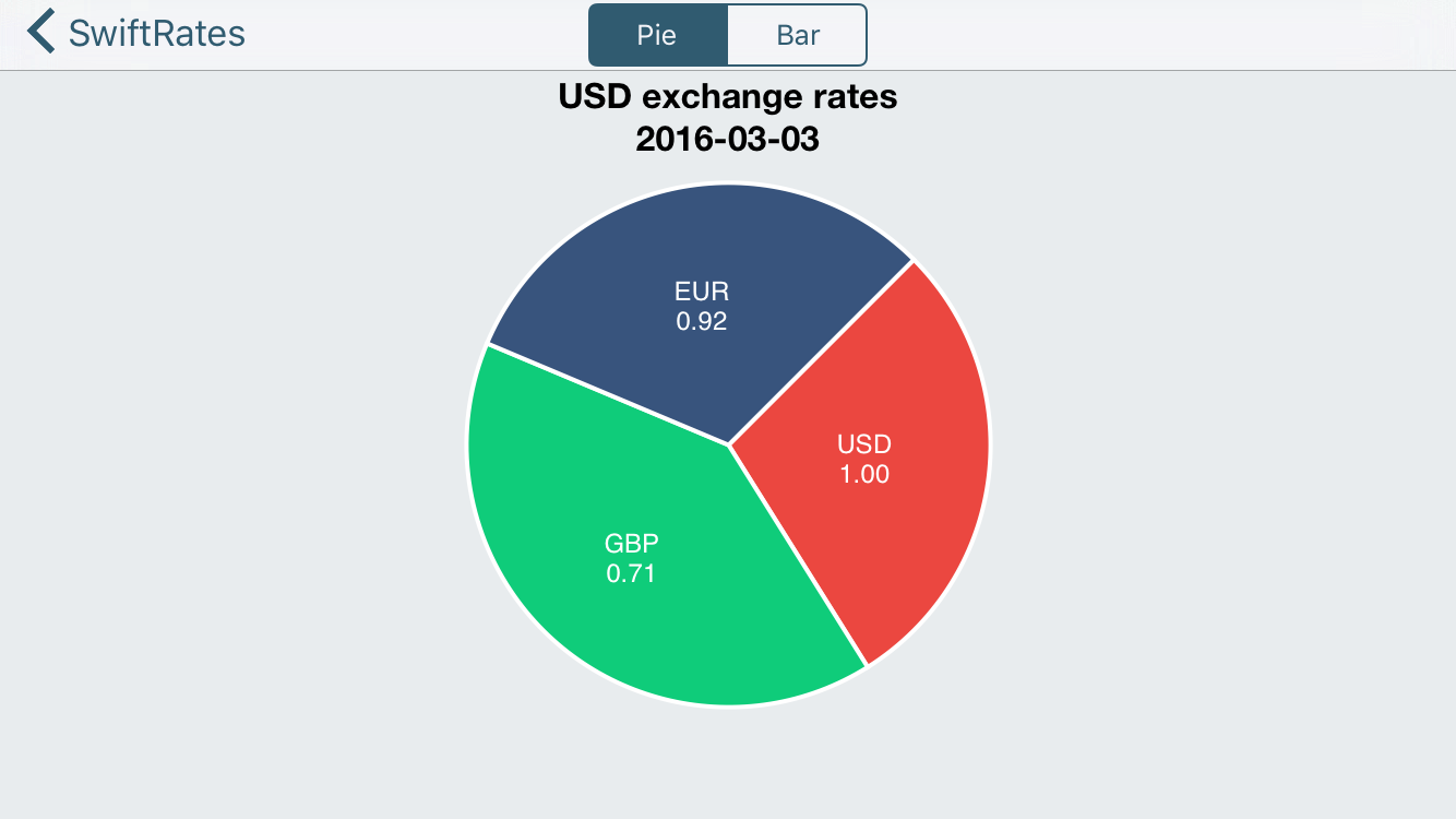 DataStore.swift一个从Fixer.io请求汇率数据的辅助类。Rate.swift显示所选日期货币汇率的model。Currency.swift货币类型的model,所支持的货币在Resources/Currencies.plist中定义。MenuViewController.swiftapp启动时显示的第一个view controller,在这里用户选择一个基本货币和两个比较货币。HostViewController.swift一个view controller容器,根据分段控件的选择来显示PieChartViewController或BarGraphViewController,并且将从DataStore中获取的汇率数据应用于所选择的view controller。PieChartViewController.swift使用饼图显示所选日期的汇率,首先会实现这个图表。BarGraphViewController.swift使用条形图显示一定天数的汇率.实现饼图后这就是个小case!