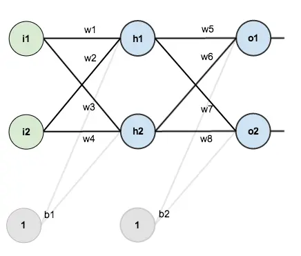让我们看看目前神经网络给定的偏差、权重和输入的0.05和0.10。为此我们要养活这些输入提前虽然网络。
