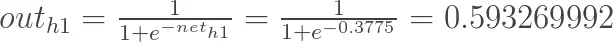 我们算出每个隐藏神经元的总输入,再利用总输入作为激活函数(这里我们使用 Sigmoid 函数)的变量,然后在输出层神经元重复这一步骤。