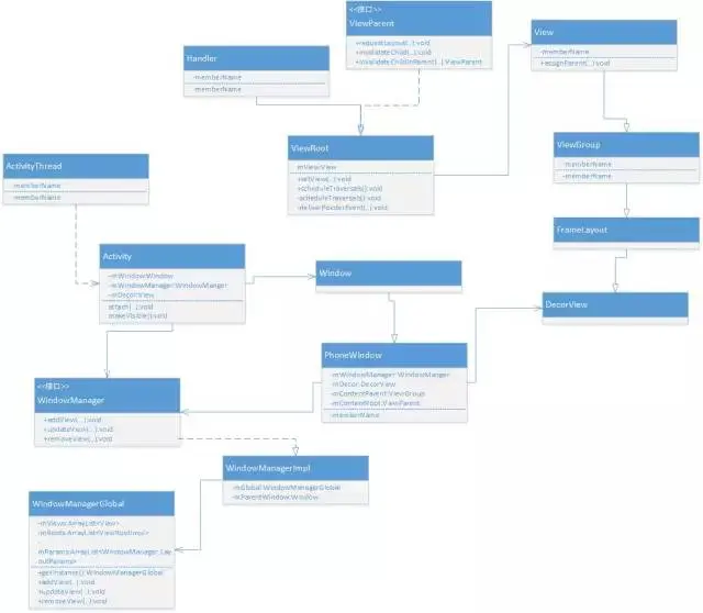 ViewRoot对应ViewRootImpl类,它是连接WindowManagerService和DecorView的纽带,View的三大流程(测量(measure),布局(layout),绘制(draw))均通过ViewRoot来完成。ViewRoot并不属于View树的一份子。从源码实现上来看,它既非View的子类,也非View的父类,但是,它实现了ViewParent接口,这让它可以作为View的名义上的父视图。RootView继承了Handler类,可以接收事件并分发,Android的所有触屏事件、按键事件、界面刷新等事件都是通过ViewRoot进行分发的。 ViewRoot可以被理解为“View树的管理者”——它有一个mView成员变量,它指向的对象和上文中Window和Activity的mDecor指向的对象是同一个对象。
