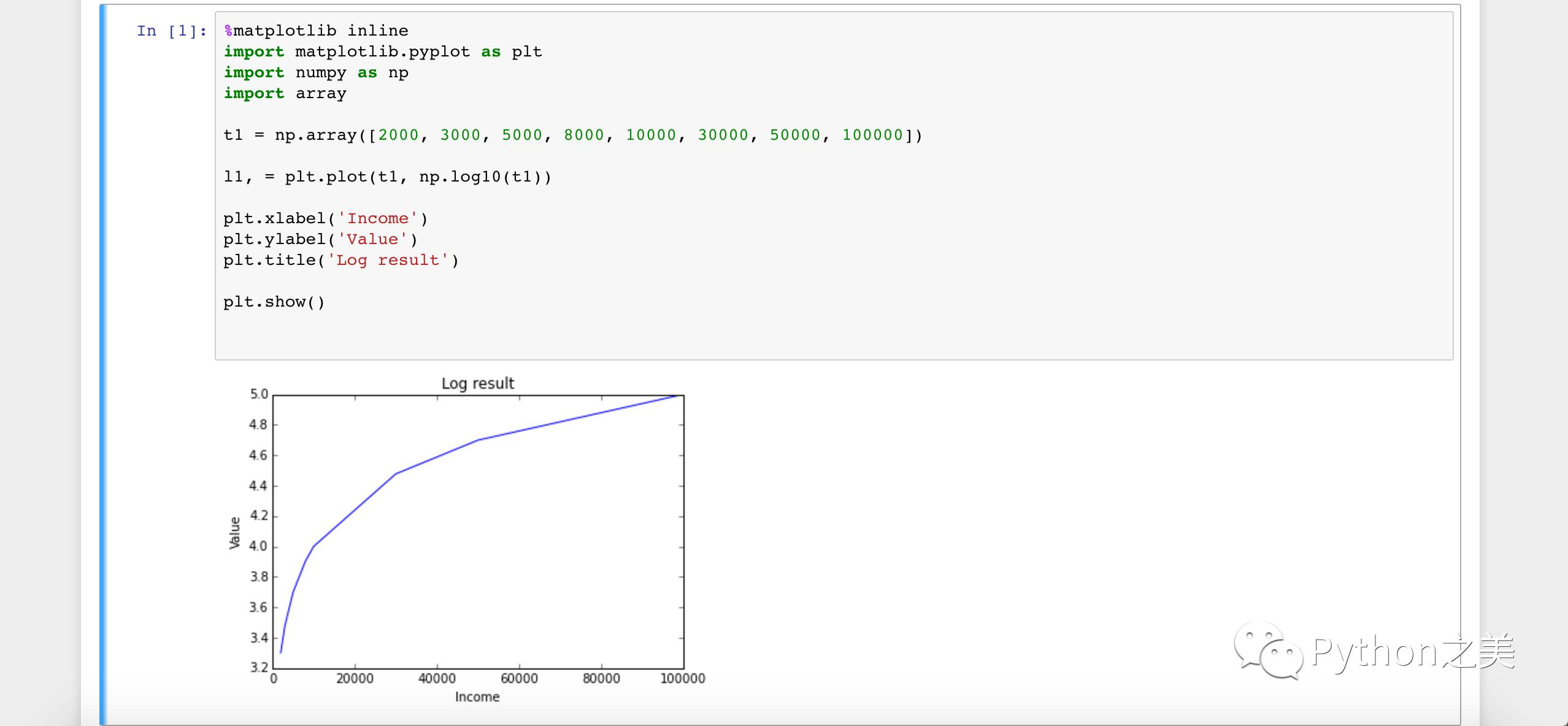 归一化的方法很多,我这里为了简单实用,选择了「对数函数转换」。通过Jupyter Notebook+Matplotlib+Numpy看一下转换的效果: