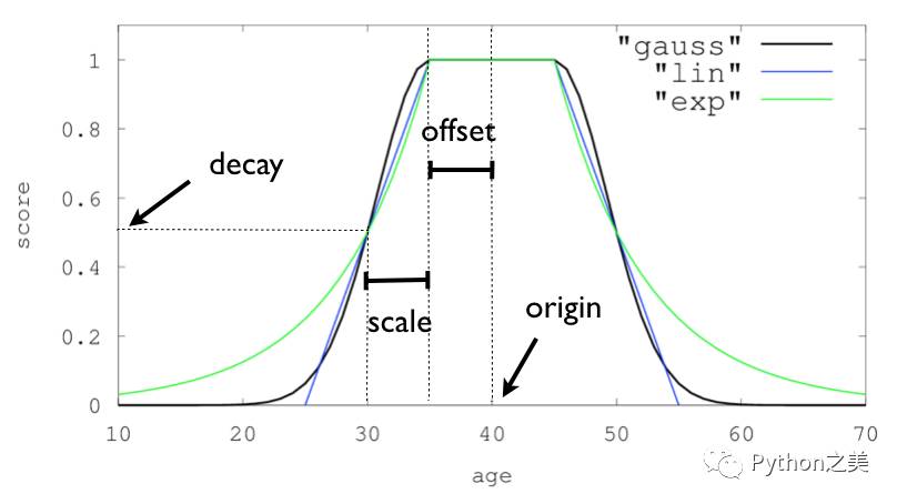 scale:衰减规模,当值超出了原点到偏移量这段范围,它所得的分数就开始进行衰减了,衰减规模决定了这个分数衰减速度的快慢
