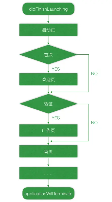 APP运行的流程一般为,首先执行AppDelegate的代理方法didFinishLaunching,进入启动页,判断是否是首次使用APP,如果是进入欢迎页,否则直接验证广告页验证,进而进入加载广告页,最后进入首页。具体流程图如下: