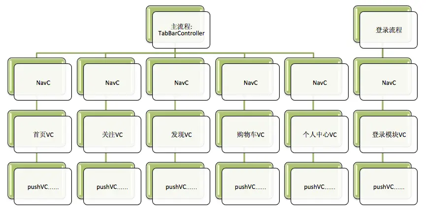 相对而言,主框架流程较为复杂,顶级容器为UITabBarController,子容器为UINavigationController,其中顶级容器放3-5个导航控制器,导航控制器的rootViewController为各模块的首页。登录框架流程及其他一般为线性流程,个别会涉及到根视图的切换,相对简单,如果画成树状结构图的话大致如下: