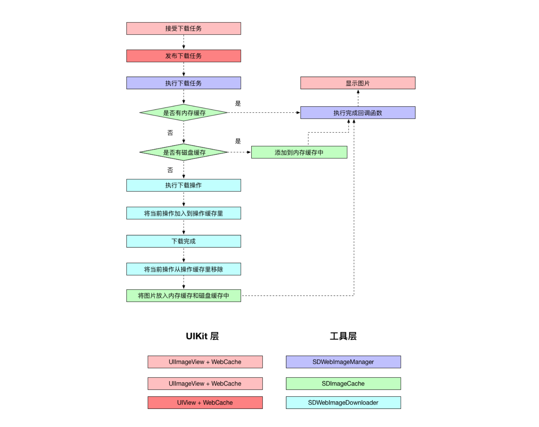 从这个流程图里可以大致看出,该框架分为两个层:UIKit层(负责接收下载参数)和工具层(负责下载操作和缓存)。