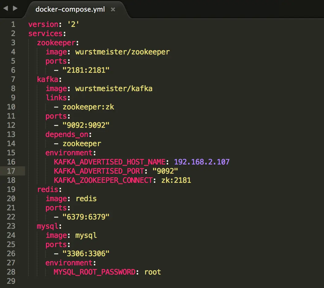 配置文件中一共配置了4个services对应4个docker container,分别是zookeeper,kafka,redis以及mysql。这里有两个地方需要设置成你实际环境的值,一个是kafka配置下面的KAFKA_ADVERTISED_HOST_NAME字段,这个需要设置成本地机器的IP。另一个是MYSQL配置下面的MYSQL_ROOT_PASSWORD,你可以设置成你想要的任何值。