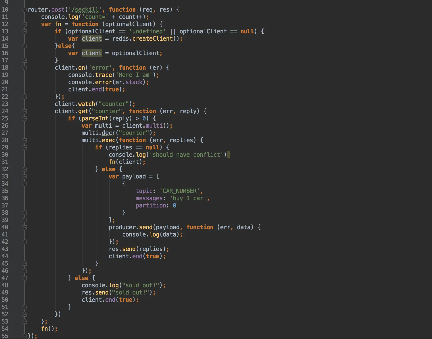 第25-28行,判断返回的库存值是否大于0,如果大于0,通过client.multi()启动一个事务,通过decr()方法将counter值减1,最后通过exec()方法提交事务;如果小于0,则执行第47行,打印卖完了并且关闭redis client。