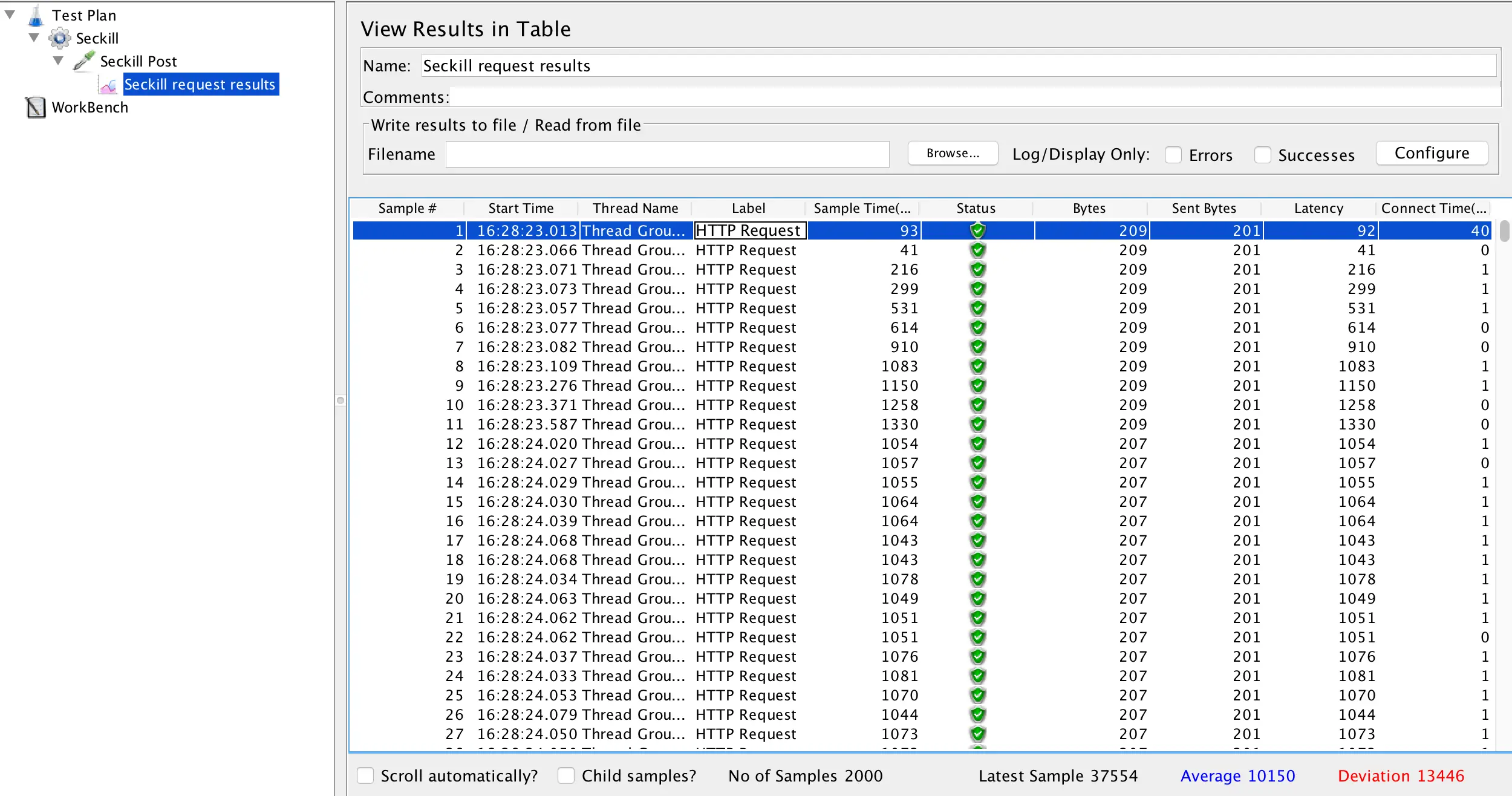 从官网下载一个JMeter的binary包,执行bin目录下的jmeter即可启动,启动后如下图新建一个名为Seckill的Thread Group,并且设置在5s内发起2000次并发请求。