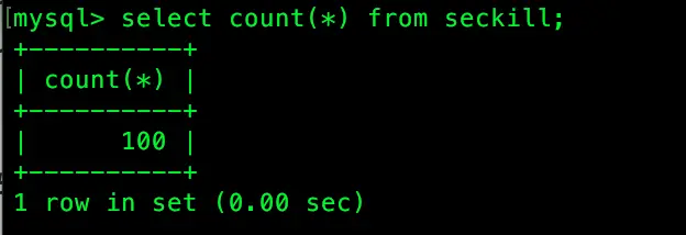 可以看到,最后redis中的counter变成0,seckill数据表中会插入100条记录,没有发生超卖或者少卖的情况。当然在实际生产环境场景中,还有许多其它需要考虑的地方,希望此文可以起到一个抛砖引玉的作用,帮助大家更好的理解秒杀场景。