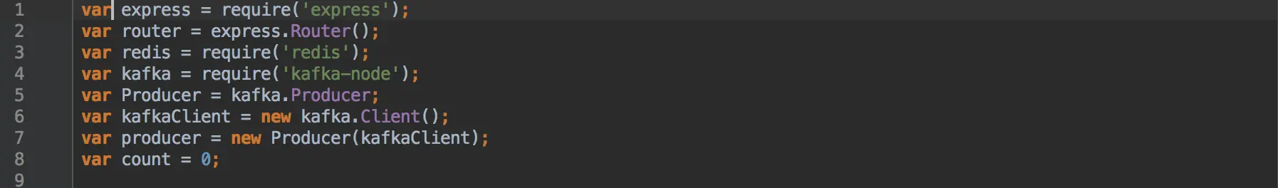 第1-8行,引入了程序需要用到的对象,nodejs的mvc框架express, redis, kafka等