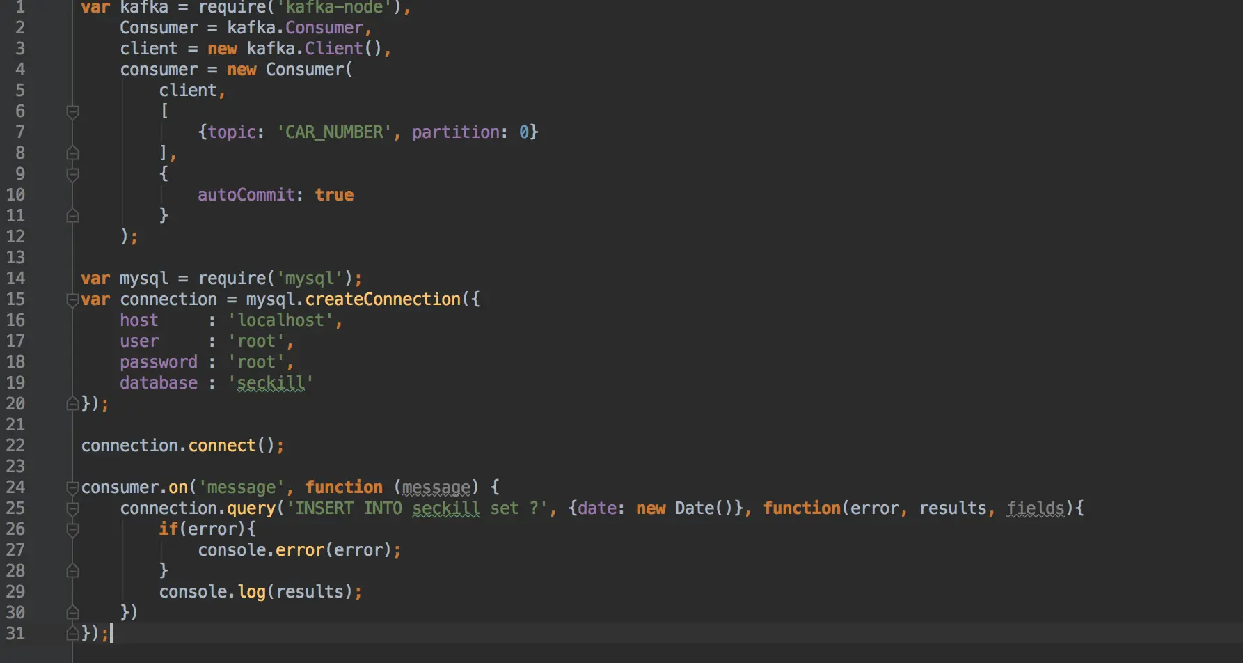 这里的代码就比较简单了,会初始化一个kafka consumer监听CAR_NUMBER topic,对于新获取的消息会去MySQL的seckill表里插入一条记录。