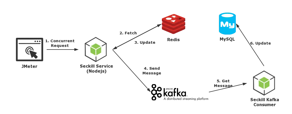 Kafka: 一个Kafka的docker container,其实这里还有一个zookeeper的docker container,Kafka用zookeeper来存放一些元数据,在程序中并没有涉及到,所以也就不单独列出来说了。Seckill service在更新完Redis之后,会发送一条消息给Kafka表示一次成功的秒杀