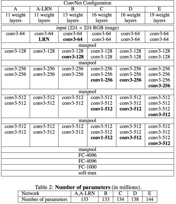 VGGnet是Oxford的Visual Geometry Group的team,在ILSVRC 2014上的相关工作,主要工作是证明了增加网络的深度能够在一定程度上影响网络最终的性能,如下图,文章通过逐步增加网络深度来提高性能,虽然看起来有一点小暴力,没有特别多取巧的,但是确实有效,很多pretrained的方法就是使用VGG的model(主要是16和19),VGG相对其他的方法,参数空间很大,最终的model有500多m,alnext只有200m,googlenet更少,所以train一个vgg模型通常要花费更长的时间,所幸有公开的pretrained model让我们很方便的使用,前面neural style这篇文章就使用的pretrained的model,paper中的几种模型如下: