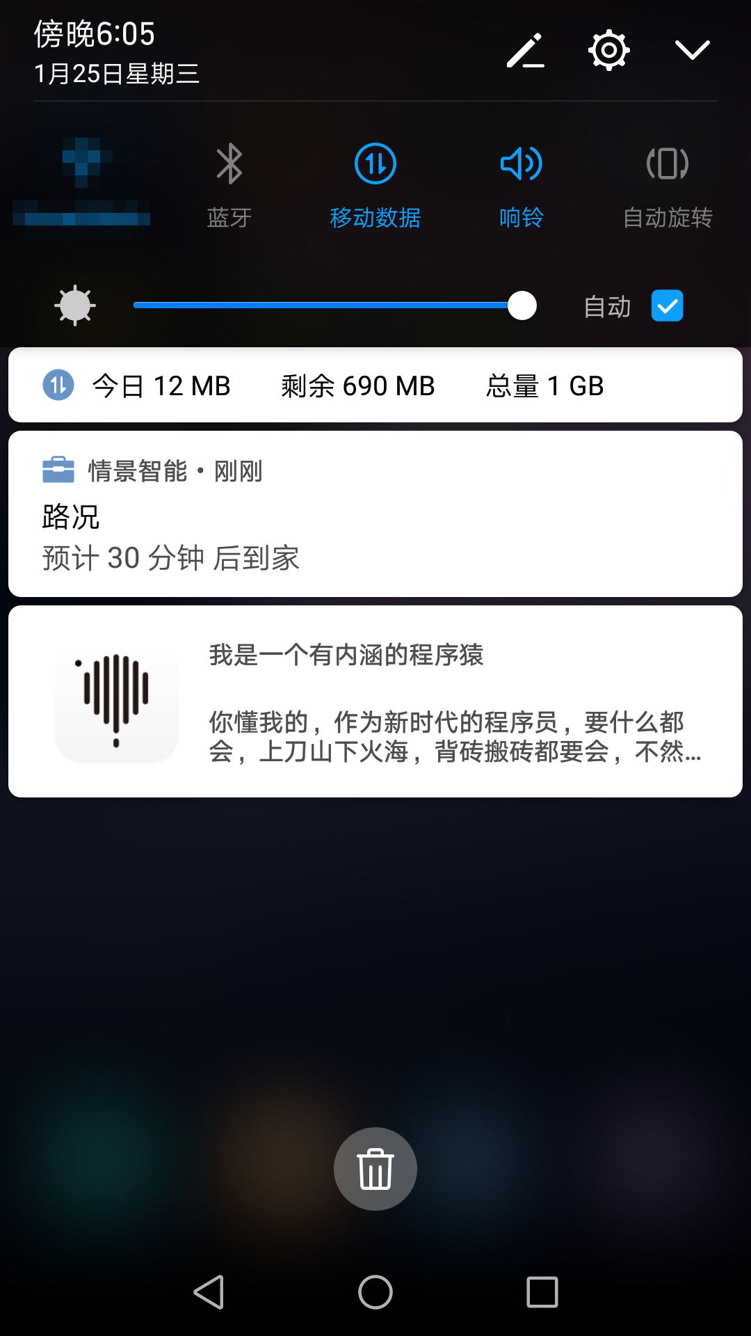 private void showRemoteView() { Intent intent = new Intent(this, MaxBoxActivity.class); intent.setFlags(Intent.FLAG_ACTIVITY_NEW_TASK); PendingIntent contentIntent = PendingIntent.getActivity(this, 0, intent, PendingIntent.FLAG_UPDATE_CURRENT); RemoteViews remoteViews = new RemoteViews(getPackageName(), R.layout.layout_custom_notifycation); remoteViews.setImageViewResource(R.id.iv_icon, R.mipmap.ic_icon); remoteViews.setTextViewText(R.id.tv_title, "我是一个有内涵的程序猿"); remoteViews.setTextViewText(R.id.tv_description, "你懂我的,作为新时代的程序员,要什么都会,上刀山下火海,背砖搬砖都要会,不然哈哈哈哈哈哈哈哈哈你就惨了"); NotificationCompat.Builder builder = new NotificationCompat.Builder(this); builder.setSmallIcon(R.mipmap.ic_icon); builder.setContent(remoteViews); builder.setContentIntent(contentIntent); if (Build.VERSION.SDK_INT > Build.VERSION_CODES.JELLY_BEAN) { builder.setCustomBigContentView(remoteViews); } NotificationManager notificationManager = (NotificationManager) getSystemService( Context.NOTIFICATION_SERVICE); notificationManager.notify(111, builder.build()); } - 效果图