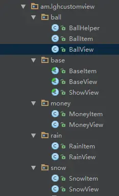 BaseView 已经是一个可以直接继承的父类了,如果仅仅只是绘制一些比较简单逻辑的自定义View,继承它足以,但是要实现上述的效果,还需要添加多一个抽象类,无论是雨景还是雪景,它们都是个体的集合,也就是说,我们需要一个"景"的抽象。