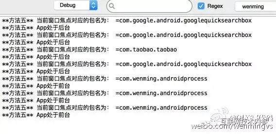 此方法无法直观的通过下拉通知视图来进行前后台的观察,请到LogCat中进行观察即可,以下是LogCat中打印的信息