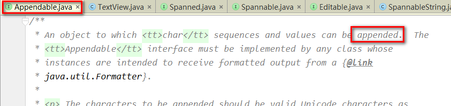 由图可见,Appendable这个接口,主要用来向CharSequence 添加/插入新的文本,通过其定义的方法可以看出其作用: