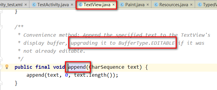 原因:在调用append方法时候,append方法内部会自动设置为TextView.BufferType.EDITABLE................. tv_setText = (TextView) findViewById(R.id.tv_setText); bt_setText = (Button) findViewById(R.id.bt_setText); // tv_setText.setText("", TextView.BufferType.EDITABLE); bt_setText.setOnClickListener(new View.OnClickListener() { @Override public void onClick(View v) { tv_setText.append(":"+(insertIndex++)); } });