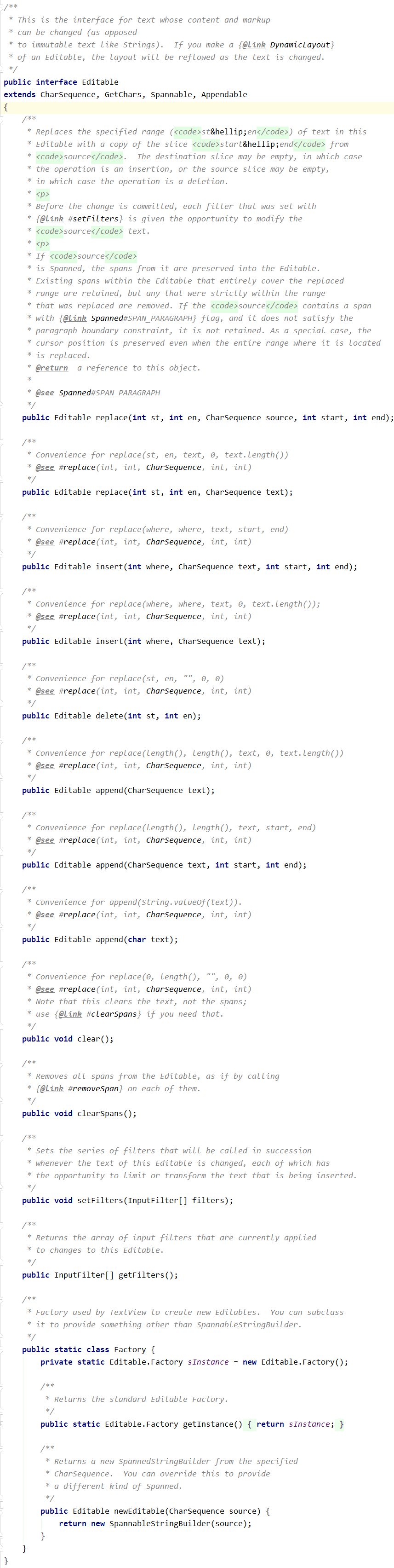 相较于Spannable,Editable还继承了另2个接口:CharSequence,Appendable。