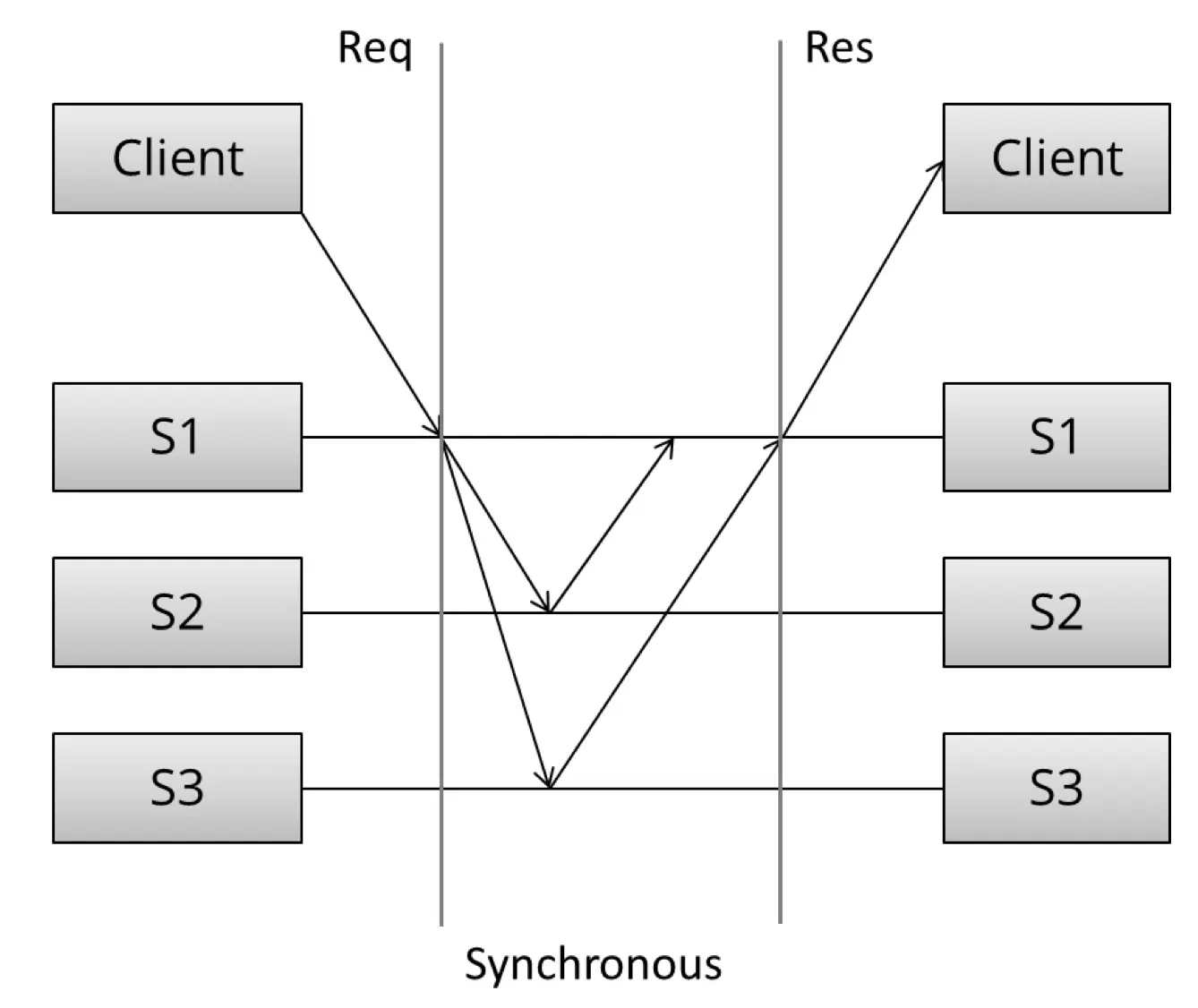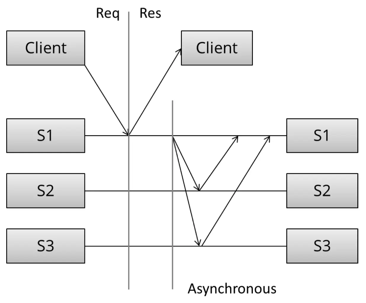 同步复制中client发送请求,接着客户端阻塞,第一个server发送请求给S2和S3,等待都响应后再回复客户端。