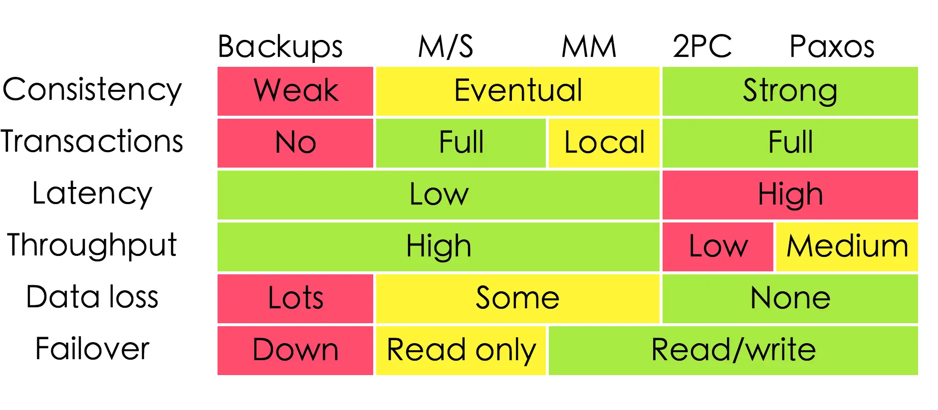 consistency, latency, throughput, data loss and failover characteristics 归根结底来自于两个不同的复制方法:同步还是异步。下面我们具体看下每一种复制方法。