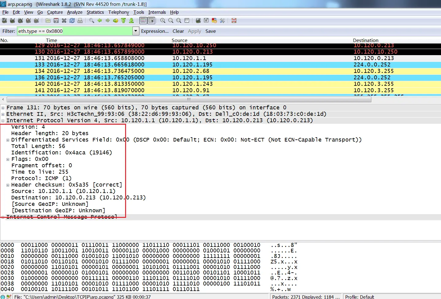 因此,设置eth.type == 0x800就能过滤出IP数据报。根据下图,再对比IPv4报文首部的数据结构,就可以更加清晰地理解IP数据报了。