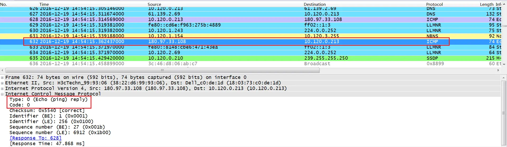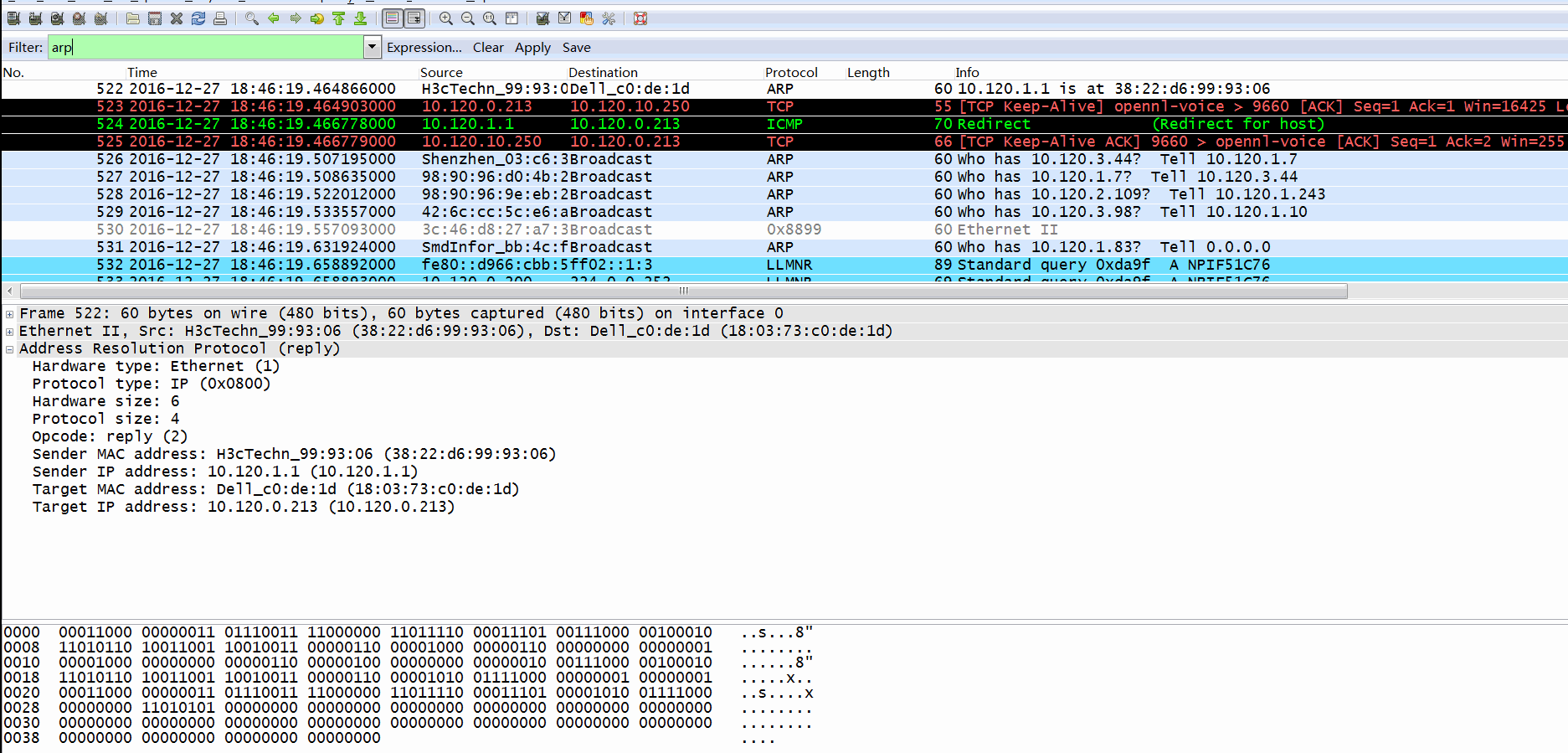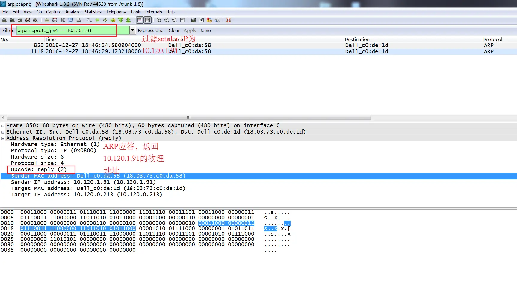 查看其中Target MAC address为我本机MAC地址,并且Opcode为2,即是10.120.1.91返回的APR应答,其中Sender MAC address,就是ARP请求得到的MAC地址。