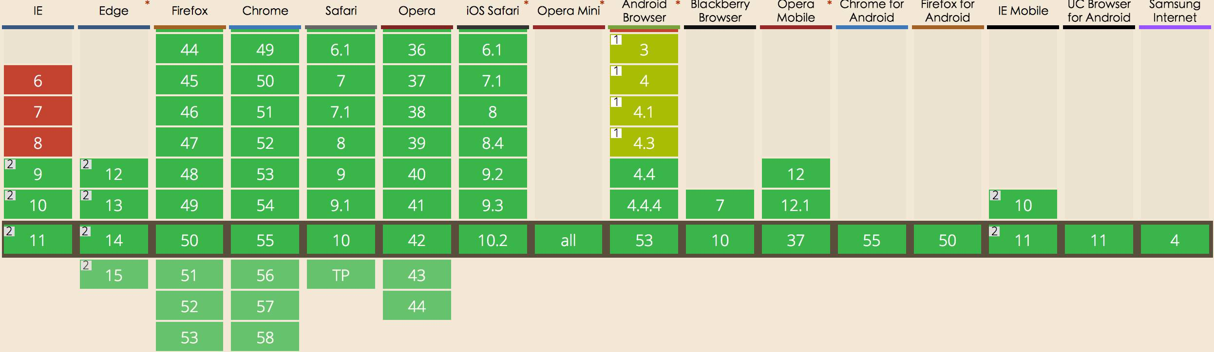 使用 svg ,这里所谓的进化并不是 svg 本身的进化,因为 svg 并不晚于 Iconfont。只是环境(兼容性)的原因导致它无用武之地。就像最近火的一塌糊涂的 AI, 其实最早在 1956 年就提出了。随着外界因素的进化,IE6/7/8 的淘汰, android 4.x 的开始,svg 的机会变到来了。先看下兼容性: