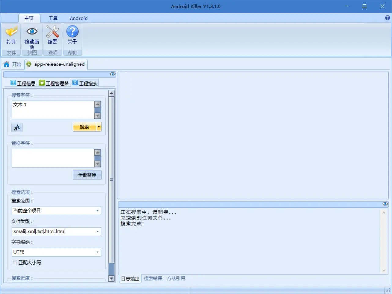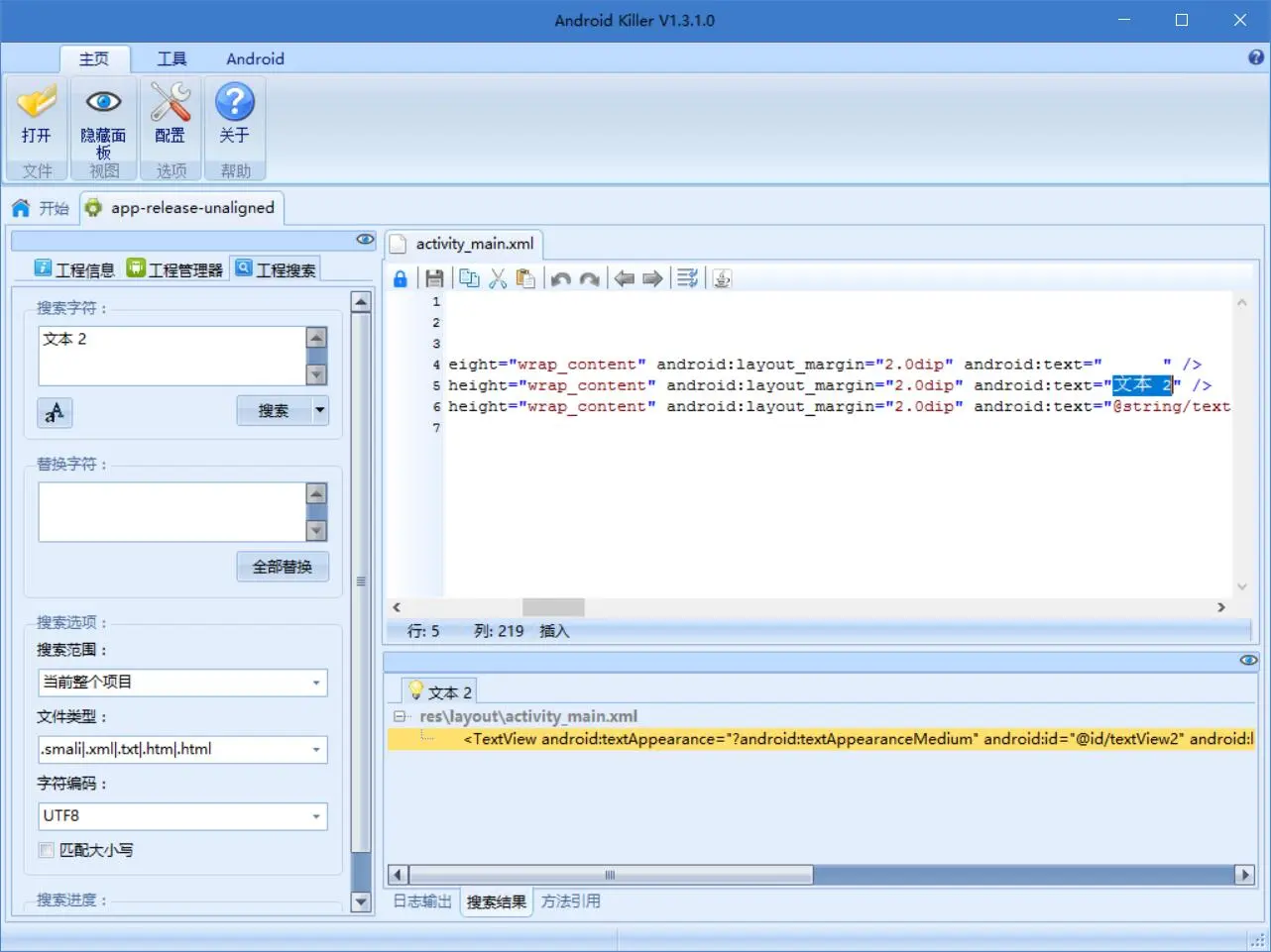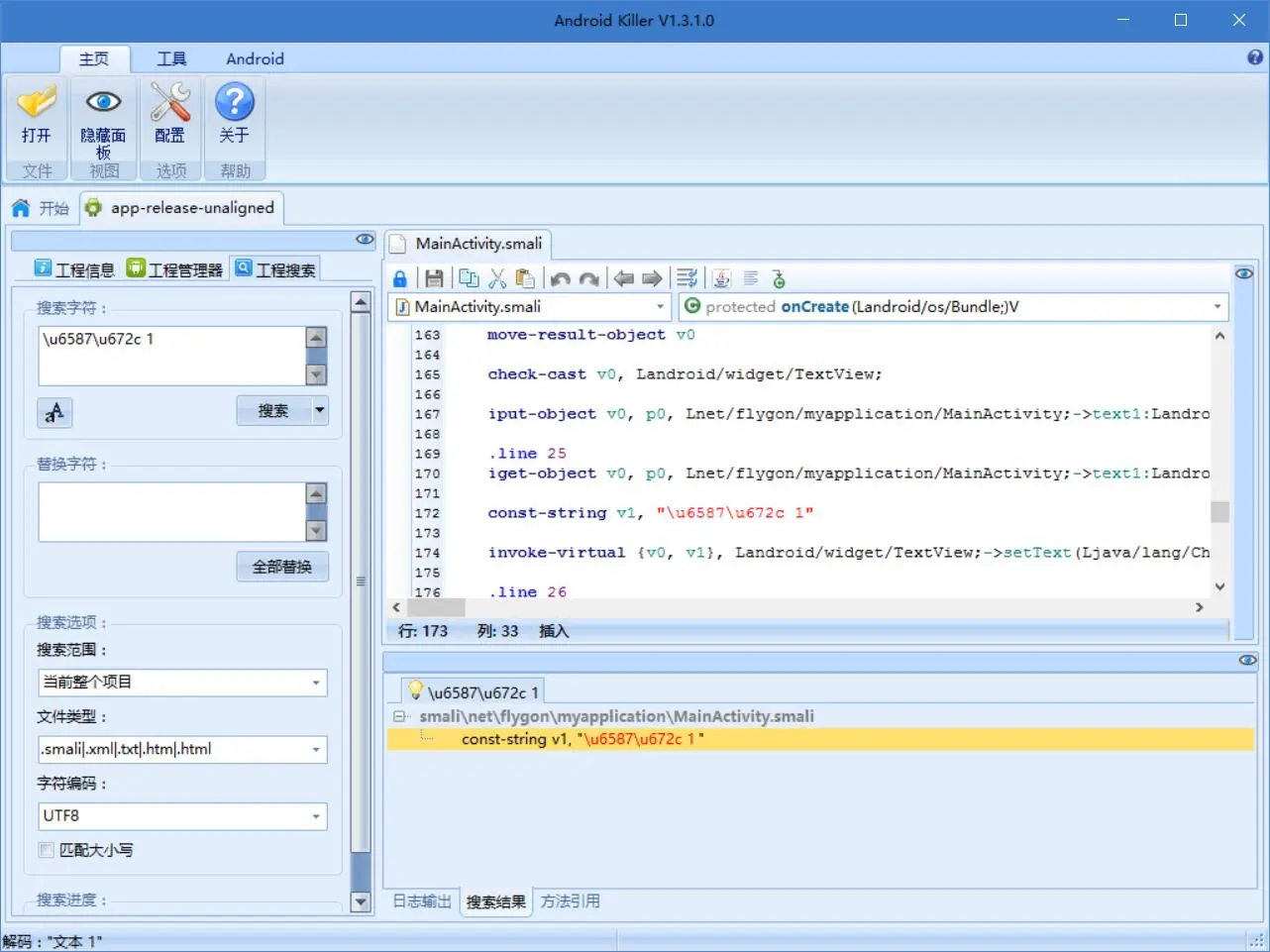 下面我们将其载入 Android Killer。完成后,在文本搜索框中搜索文本 1。
