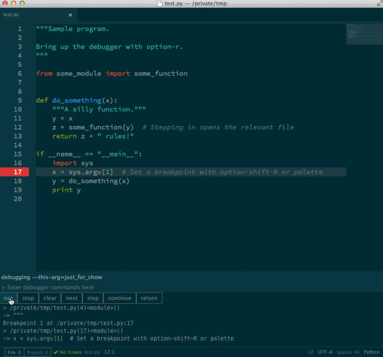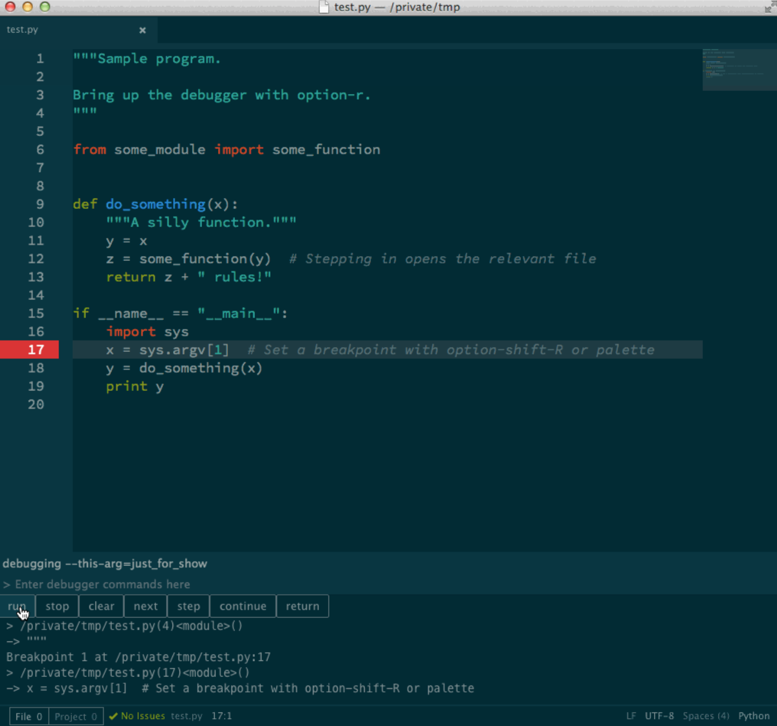 Sublime 的部分我沒有找到什麼太好的 Python debugger,有些甚至還是直接在程式碼中插入 pdb 的程式碼來達到中斷的效果......