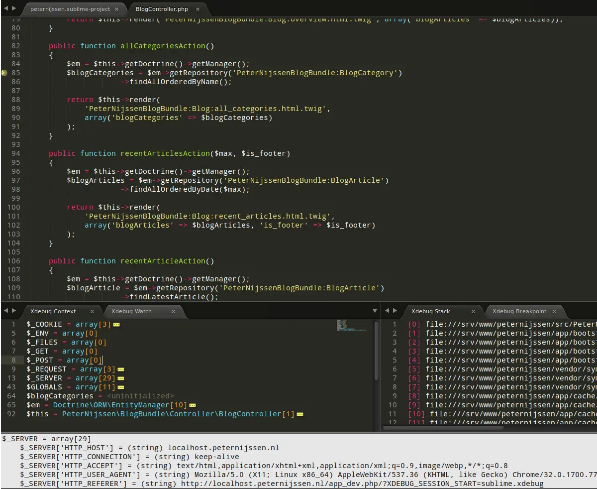 以 Sublime 來說,(我猜測)受限於 plugin API 的限制,所以即使有 debugger 外掛,大多都只能用 editor 的外觀兜出一個難看又難用的介面,以 Xdebug 為例: