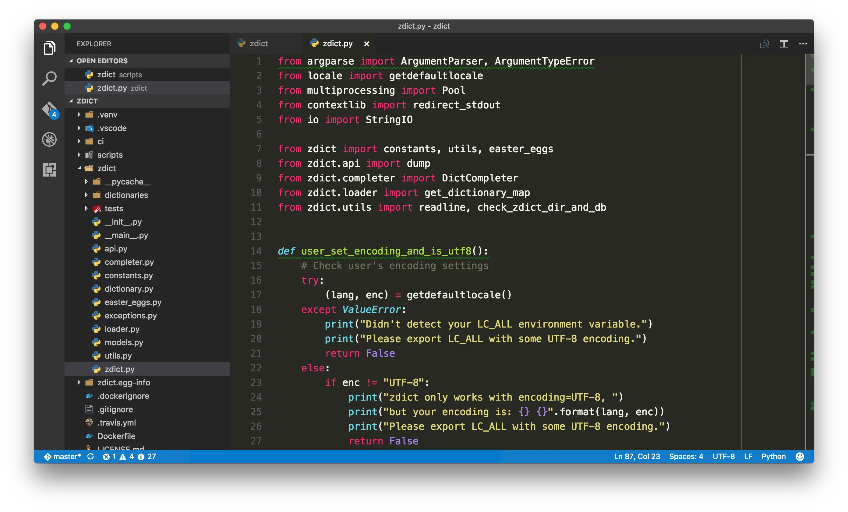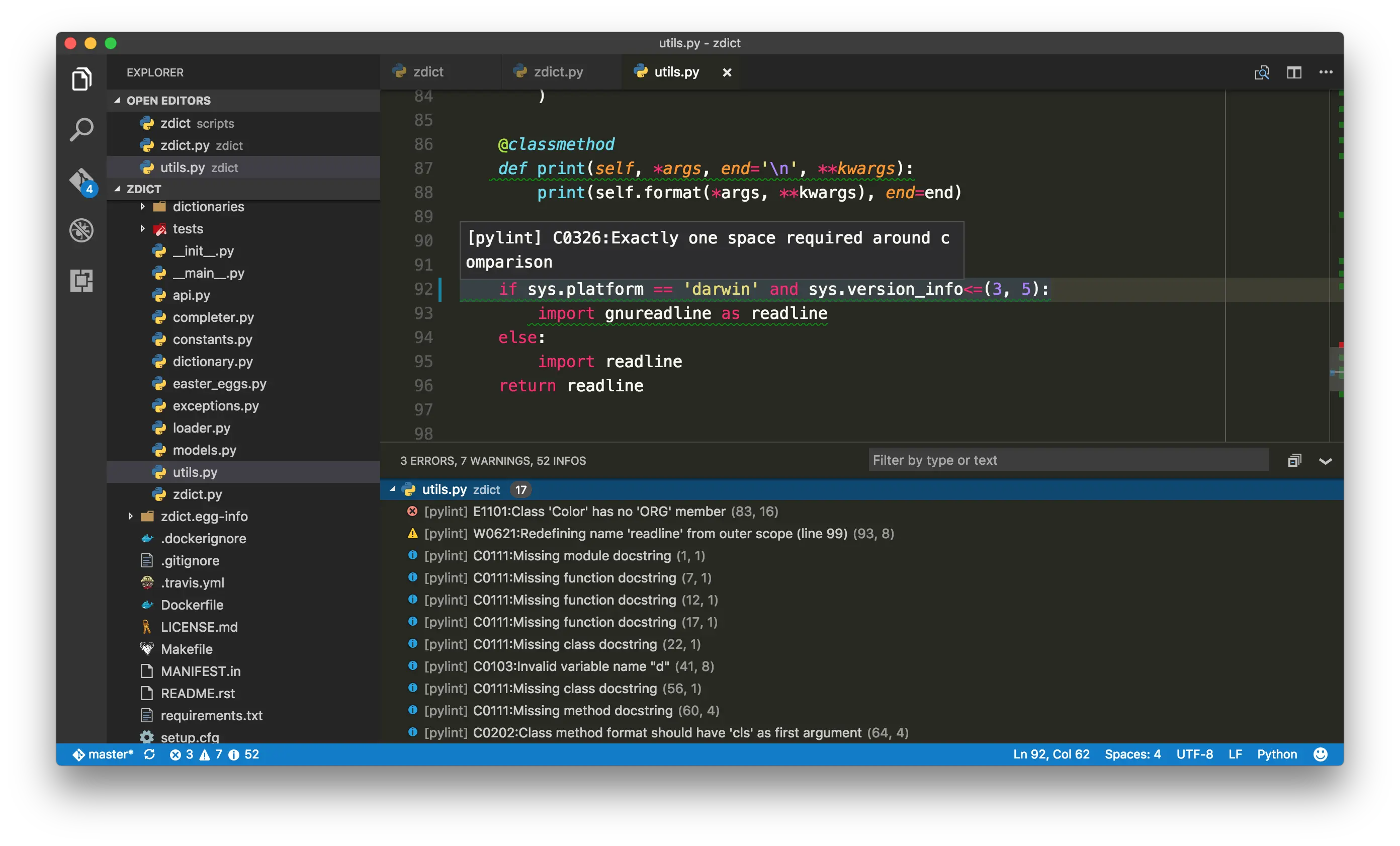 Pylint 具備了最高度的整合,不同等級的提示(錯誤、警告、資訊)會用不同顏色的蚯蚓底線標註出來。另外也可以看到 VS Code 本身內建了顯示這些警告的面板,在左下角狀態列也能很清楚的看到警告的數量。(順帶一提旁邊還可以很方便的看到目前所在的 branch)