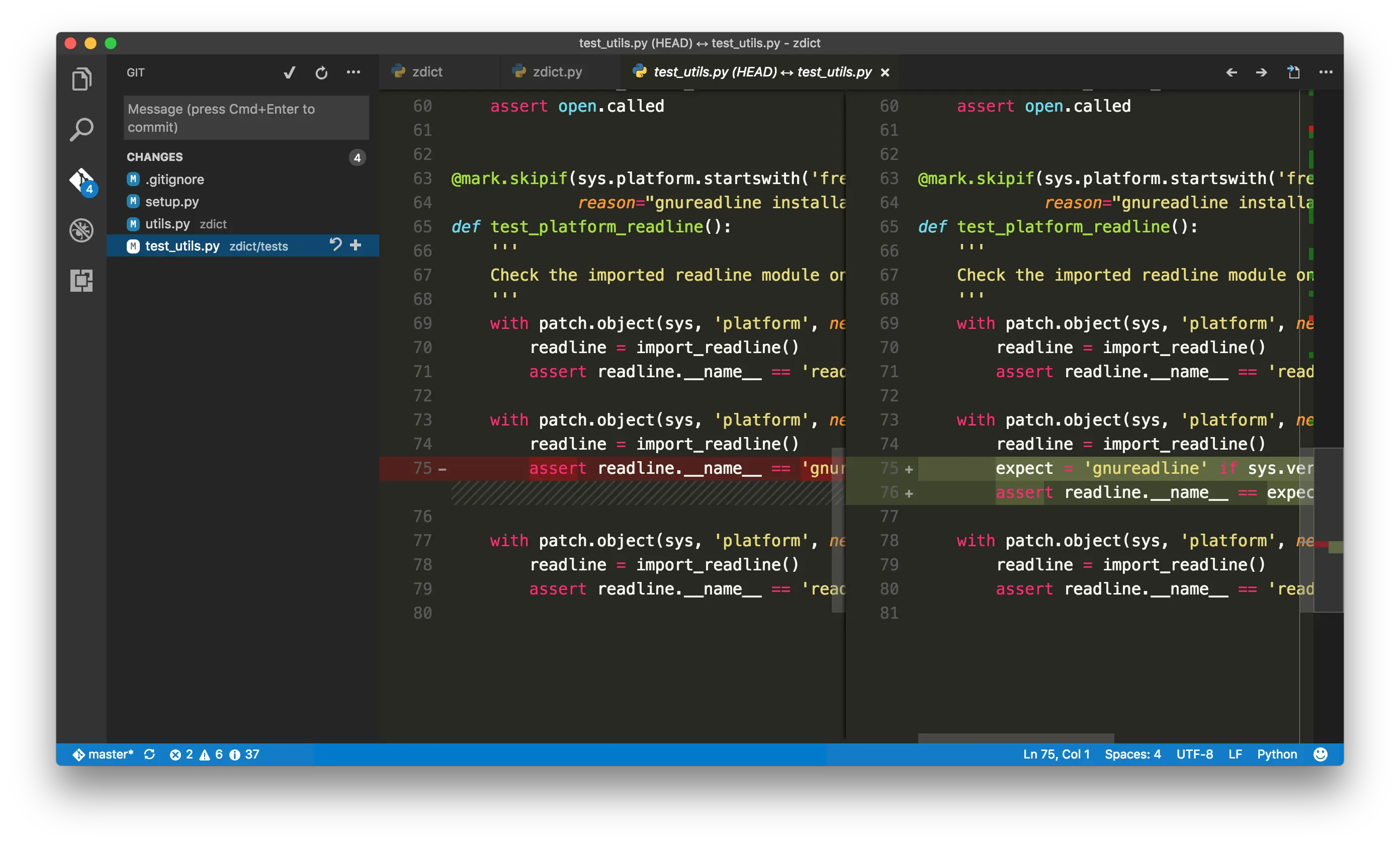 與 Sublime、Atom 不同的是,VS Code 直接原生整合了 Git 的基本功能,所以包含 commit、diff、resolve conflict 等等都可以直接透過 GUI 來操作。另外,編輯器上也不需要另外安裝外掛就可以顯示哪些程式碼是有更動過的。