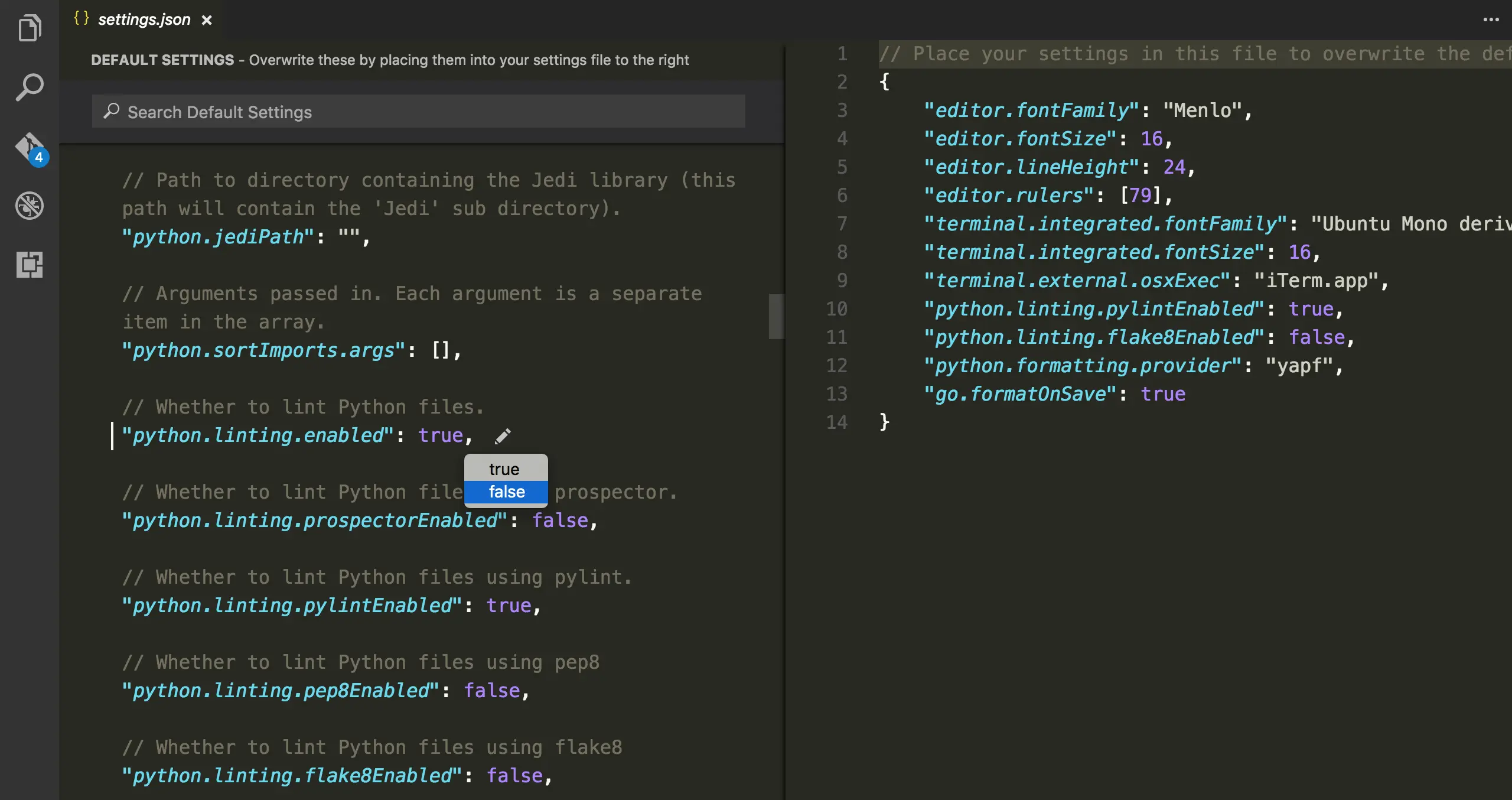 VS Code 和 Sublime 一樣是透過 json 來撰寫編輯器設定,不像 Atom 有 GUI 的介面,而唯一不同之處是 Sublime 會將套件的設定獨立分開來。VS Code 在近期的更新中又加入了貼心小功能,不僅把設定分門別類,以往若要 override 預設的設定需要一個一個複製到右邊,現在介面上直接提供選單讓你快速複製,如果是 boolean 的選項還可以直接選擇呢!
