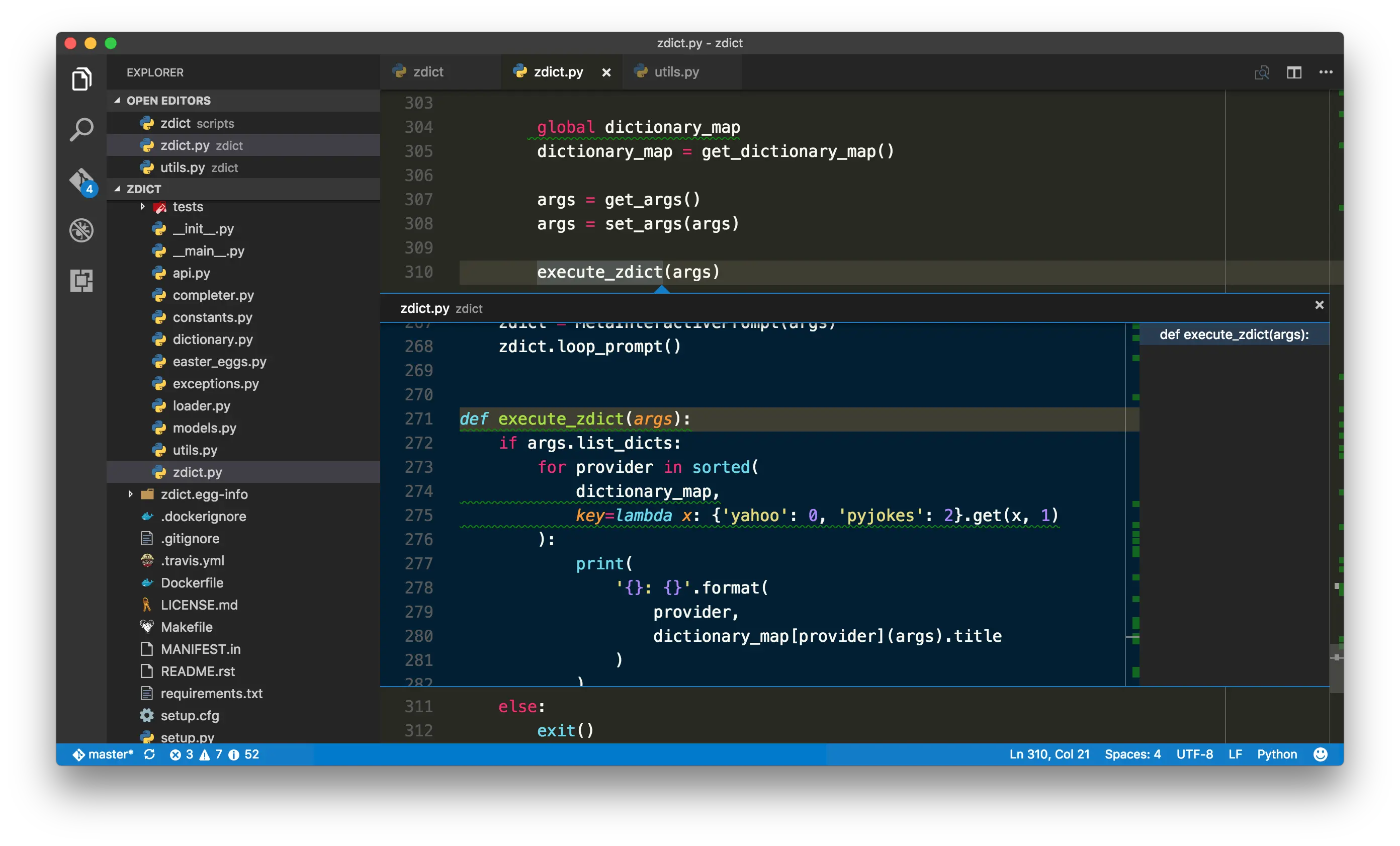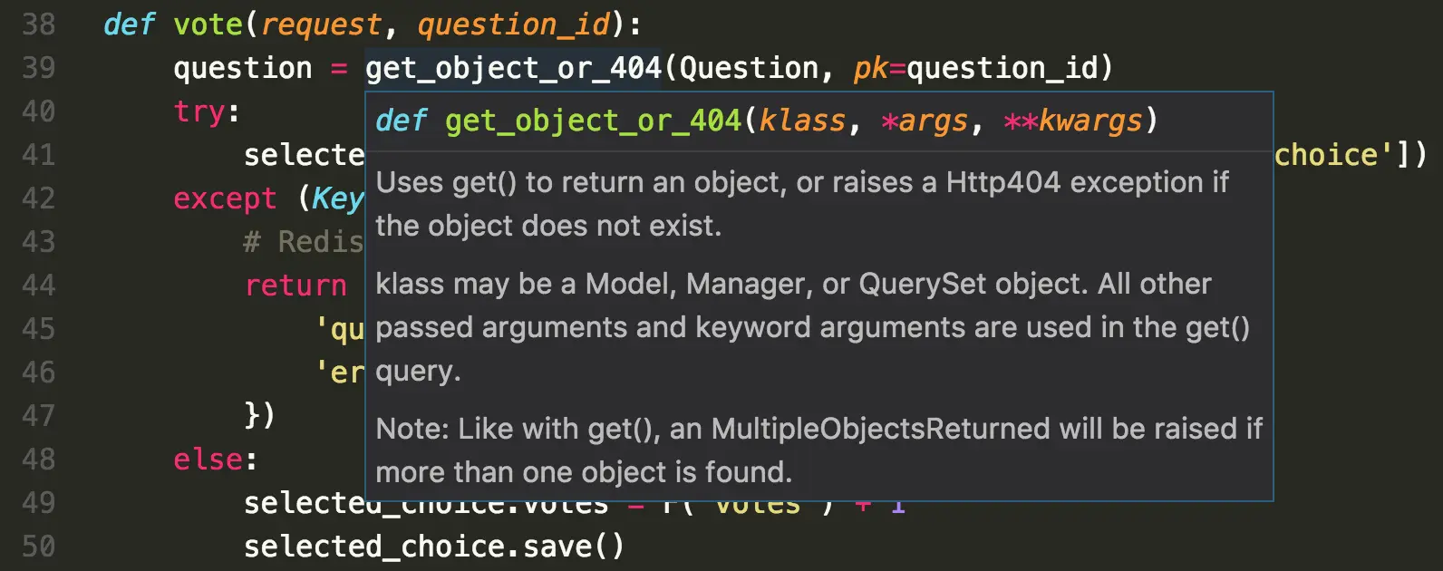 而我最愛的功能則是 Peek Definition,這最初是微軟在 Visual Studio 2013 所加入的功能,如同它的名稱 peek 一樣,可以在不切換檔案的情況下預覽在別處的定義,甚至還可以直接修改!這個功能不限於 Python,只要程式語言的第三方套件有實作這個整合就可以使用。