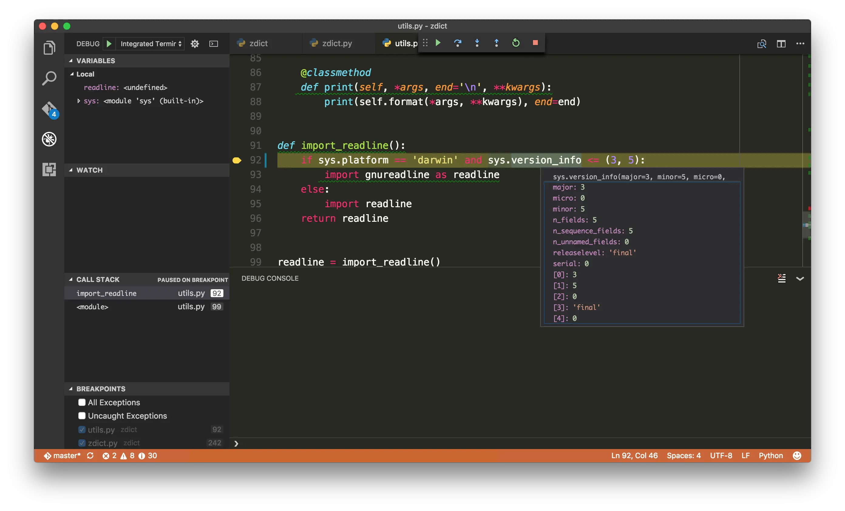 這點是讓我跳槽 VS Code 很大的原因之一,它在最初版本就考慮到對於 debugger 外掛的支援,於是設計了一個 debugger 框架以及 GUI,讓各個語言的第三方套件能夠在 VS Code 上提供一致的操作體驗,包含 breakpoint、watch、call stack 等等。